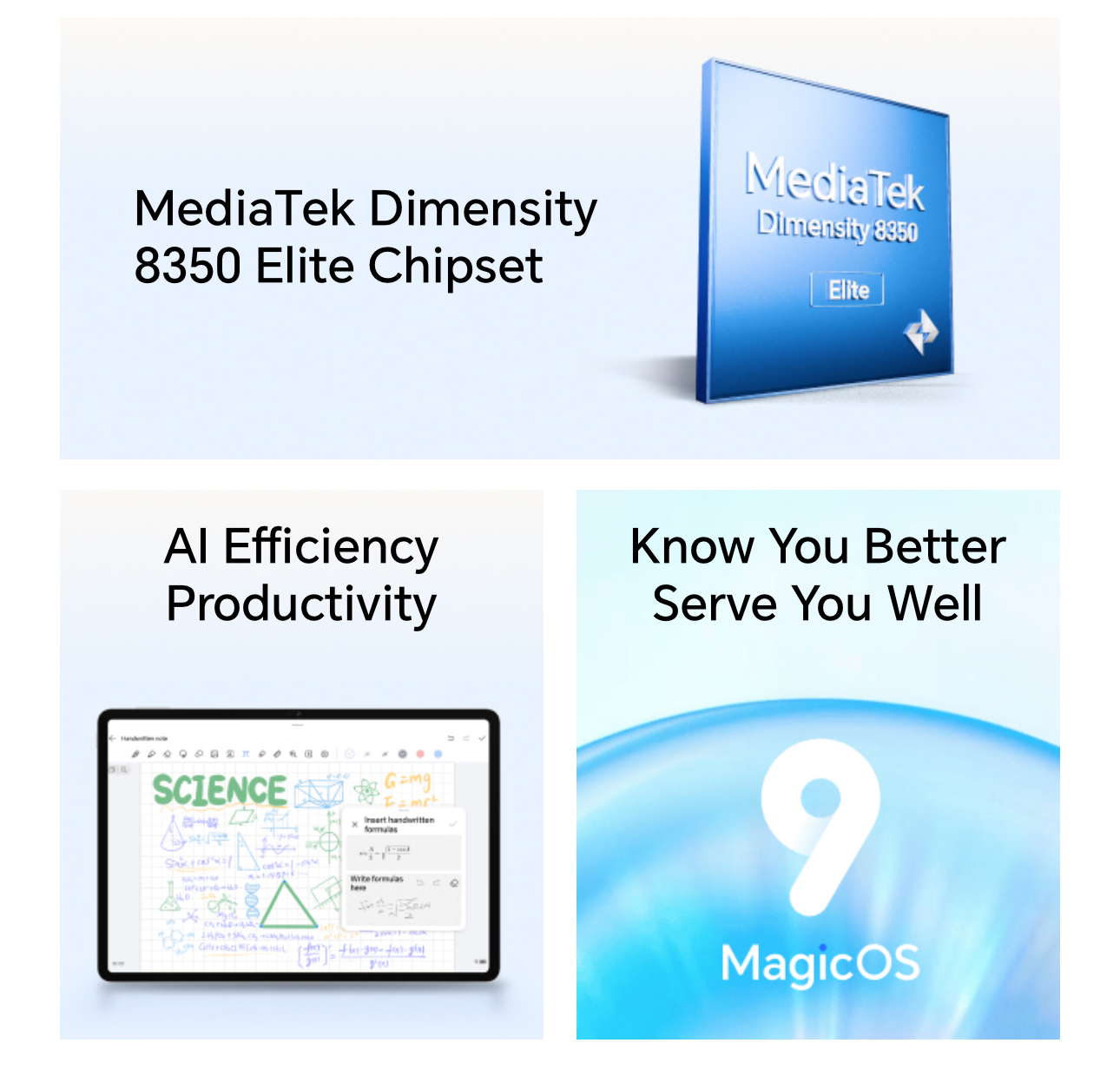 Selain itu, HONOR Pad V9 ini dikuasakan cipset MediaTek Dimensituky 8350 Elite, 12GB RAM + 12GB HONOR RAM Turbo, 256GB storan dalaman dan MagicOS 9.0 yang berasaskan Android 15. Antara AI yang disertakan adalah AI Honor Notes, AI Voice Recording Synchronization, AI typesetting & summary dan banyak lagi.