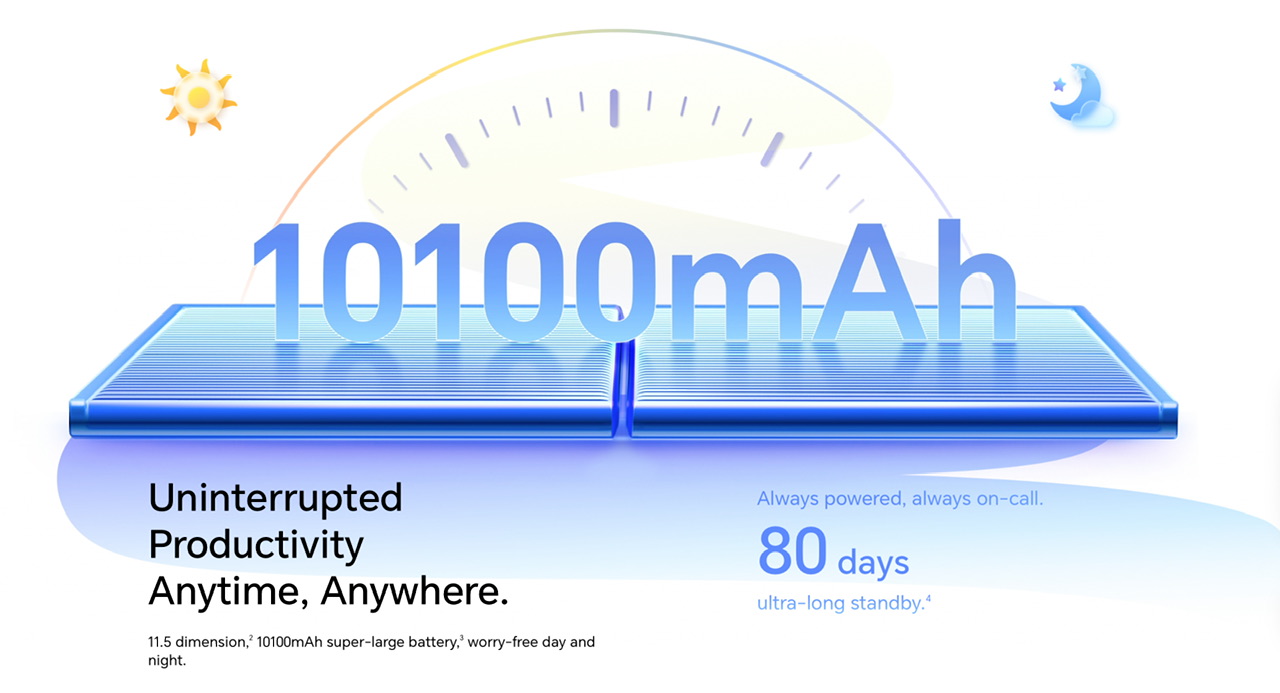 Walaupun hadir dengan profil rekaan yang nipis, HONOR Pad V9 memiliki saiz bateri yang agak besar iaitu 10,100mAh dan ini memberikan pengguna jangka hayat bateri yang lebih lama walaupun digunakan sepanjang hari untuk tujuan hiburan, kerja dan banyak lagi.