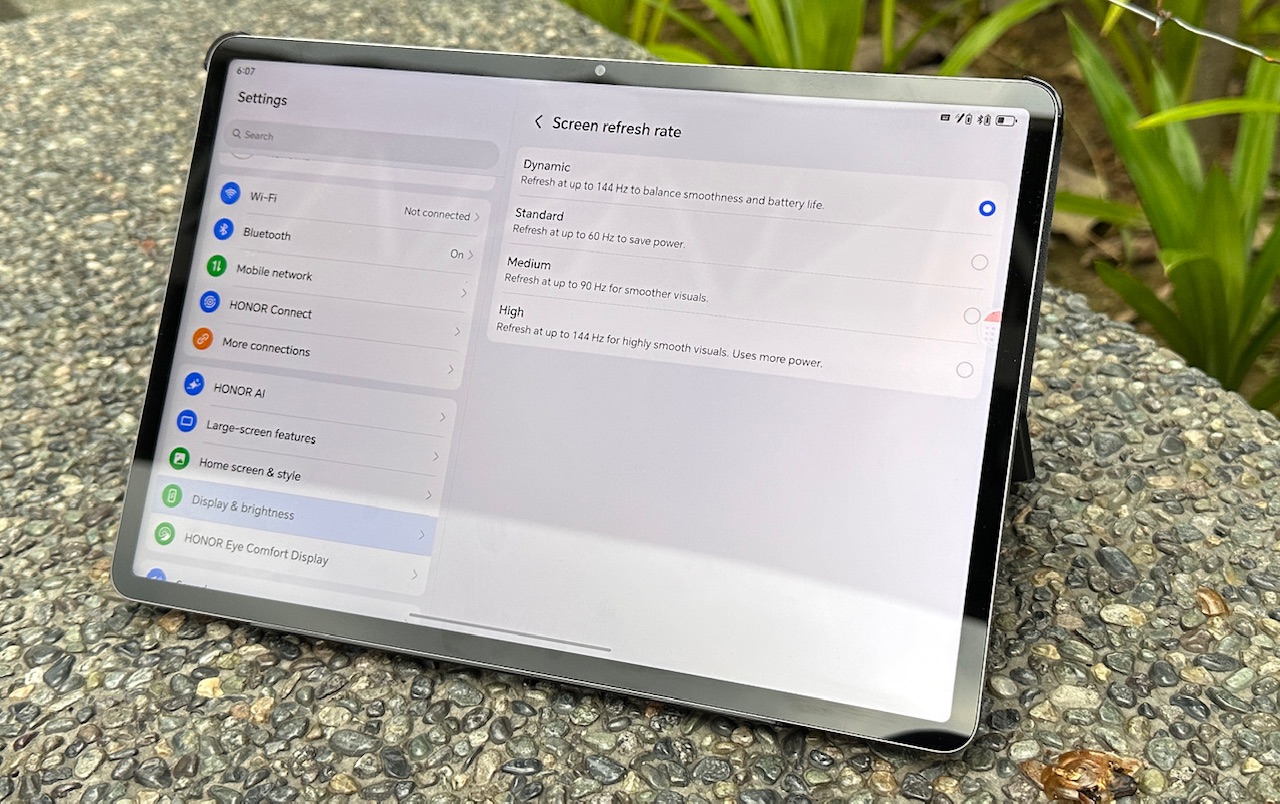 Bercakap mengenai kadar segar semula, panel skrin Pad V9 ini mampu menyokong kadar sehingga 144Hz dan terdapat beberapa pilihan tetapan kadar segar semula yang ditawarkan iaitu Dynamic (sehingga 144Hz), Standard (60Hz), Medium (90Hz) dan High (sehingga 144Hz namun lebih mengutamakan visual berbanding bateri).