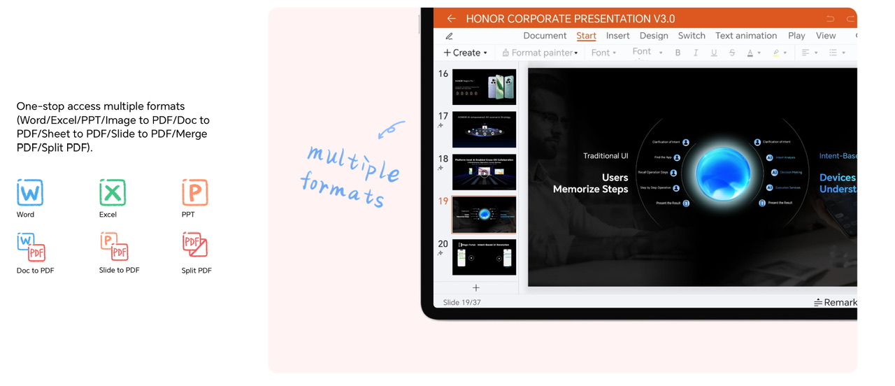 Antara jenis dokumen yang disokong pada HONOR Docs adalah Words (Doc), Excel (sheet) dan Power Point (Slide) serta sokongan menukar pelbagai format dokumen kepada PDF termasuk ‘merge’ PDF dan ‘split’ PDF.
