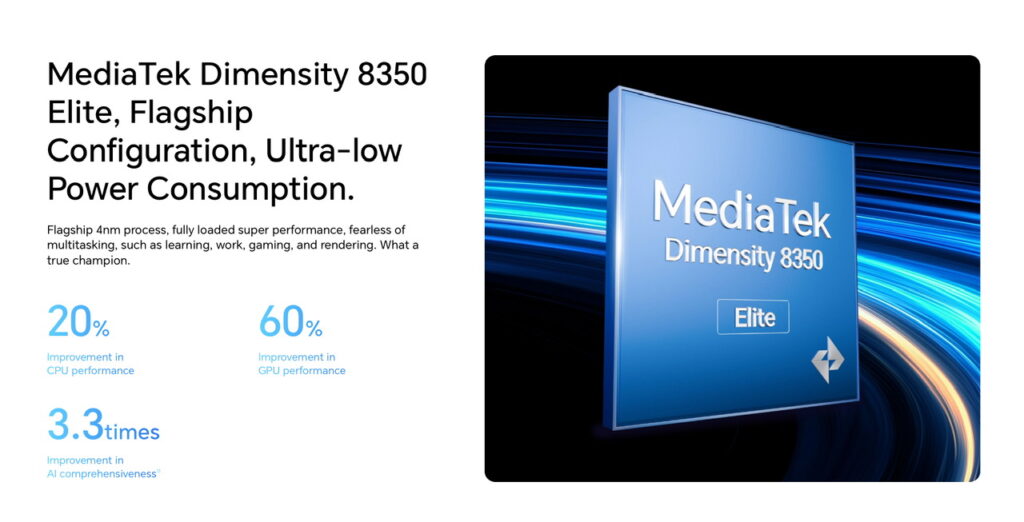 Selain itu, Dimensity 8350 Elite juga menawarkan sehingga 20% peningkatan prestasi CPU dan sehingga 60% peningkatan GPU serta 3.3 kali lebih baik dalam tugas yang meliputi AI.
