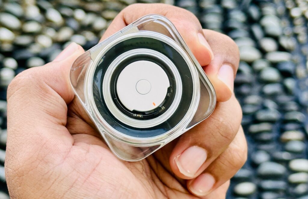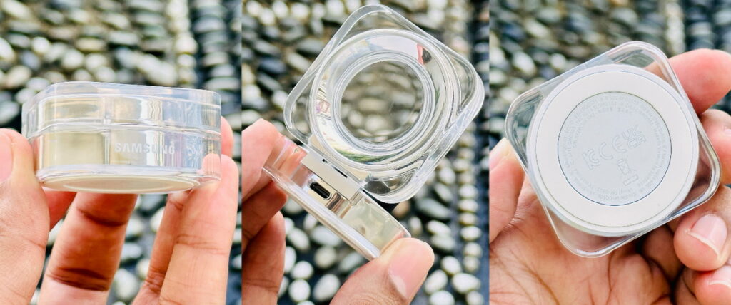 Bercakap mengenai bekas pengecasan Galaxy Ring, ianya tampil didalam kemasan lutsinar yang membolehkan cincin dilihat dan pada ruang penyimpanan cincin terdapat lampu berwarna putih yang berfungsi sebagai ‘welcome light’ apabila bekas dibuka atau lihat kadar pengecasan dengan menekan butang tengah. Tekan selama 3 saat untuk masuk ke ‘pairing mode’.