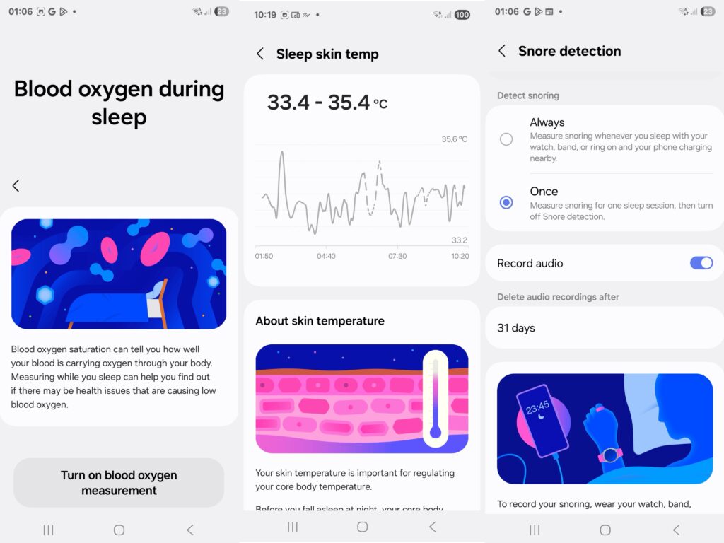 Menariknya, Galaxy Ring memberikan bacaan yang tepat tentang waktu tidur dan fasa tidur anda. Ianya juga mempunyai ciri untuk mengesan samada anda berdengkur namun dengan bantuan telefon pintar kerana Galaxy Ring tidak mempunyai mikrofon.