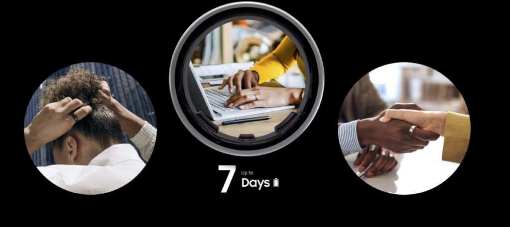Samsung Galaxy Ring mendakwa cincin bersaiz 13 mampu menawarkan sehingga 7 hari penggunaan dan ianya boleh dicaj penuh didalam 60 minit manakala bekas pengecasan mampu menawarkan 2 pengecasan penuh kepada Galaxy Ring.