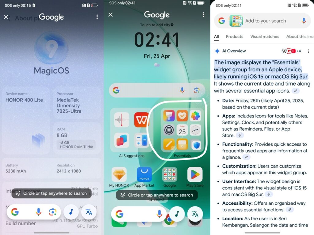 Menariknya, 400 Lite ini hadir dengan sistem operasi terbaru HONOR iaitu Magic OS 9.0 yang berasaskan Android 15 yang membawakan beberapa ciri AI seperti Magic Portal, Circle to Search, AI Translation, AI Eraser dan AI Outpainting.