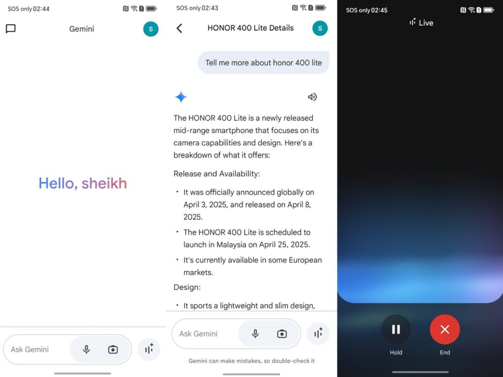Aplikasi Google Gemini pada HONOR 400 Lite ini hadir sebagai pembantu AI yang membolehkan pengguna untuk meningkatkan lagi kreativiti dan produktiviti mereka. Pengguna boleh berinteraksi dengan Gemini untuk membantu mereka belajar, memikirkan idea, menulis, merancang acara dan banyak lagi. Melalui teks, suara, gambar dan kamera, pengguna boleh mendapatkan bantuan dengan cara baharu.