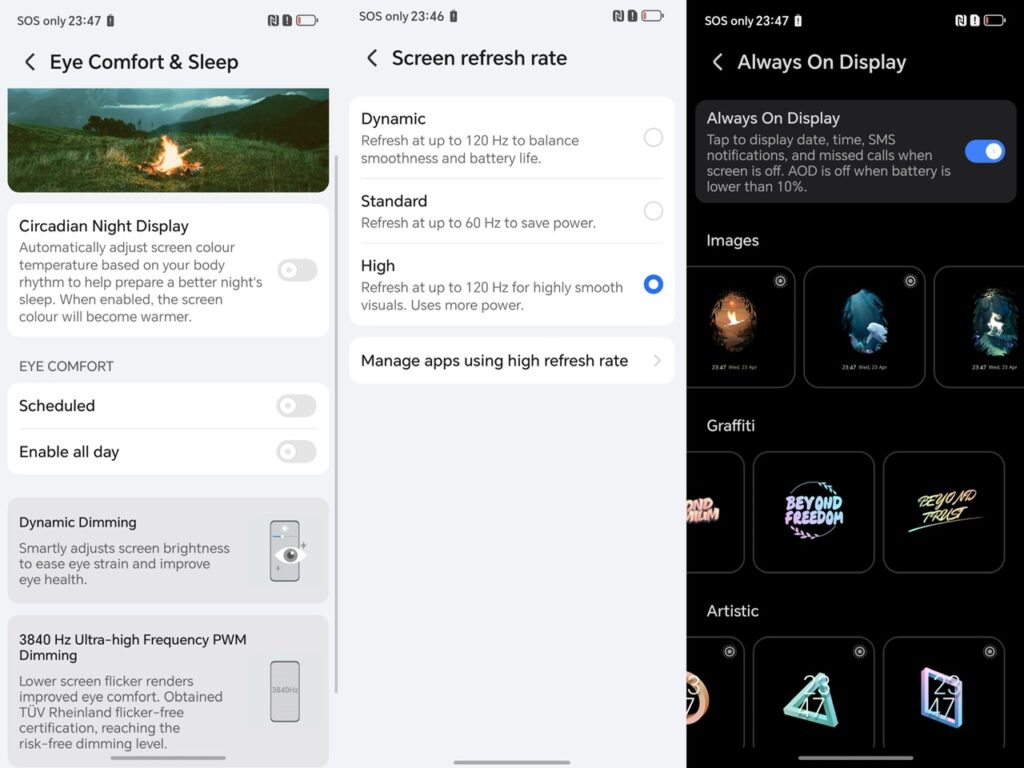 Bercakap mengenai tetapan kadar segar semula yang ditawarkan, HONOR 400 Lite menawarkan kadar segar semula maksima 120Hz namun terdapat tiga kadar yang ditawarkan iaitu Dynamic, Standard dan High.