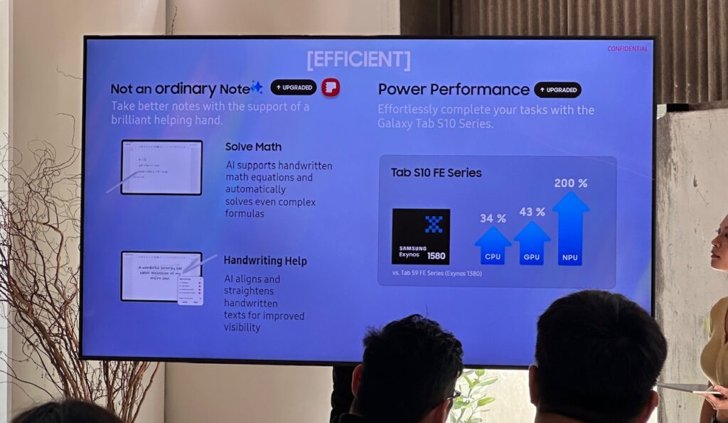 Apabila dibandingkan dengan cip Exynos 1380 yang digunakan pada Galaxy Tab S9 FE, ianya menawarkan 34% peningkatan prestasi CPU, 43% peningkatan pretasi GPU dan 200% kuasa NPU.