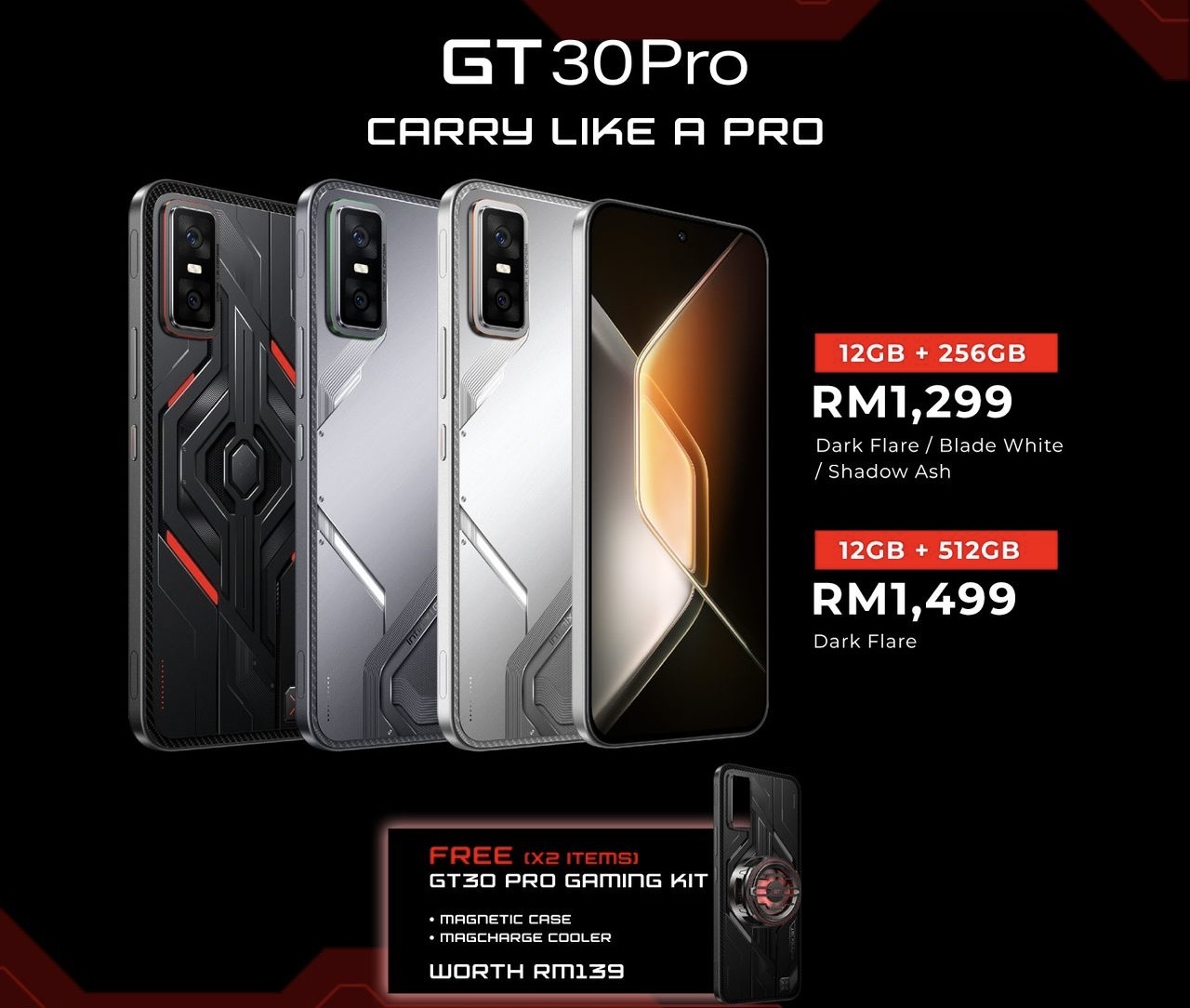 Bercakap mengenai harga, Infinix GT 30 Pro akan ditawarkan pada harga RM 1,299 bagi versi 12/256GB dan RM 1,499 bagi versi 12/512GB didalam tiga Shadow Ash, Blade White dan Dark Flare (untuk versi 12/512GB sahaja). Setiap pembelian juga akan menerima MagCharge Cooler dan MagCase.