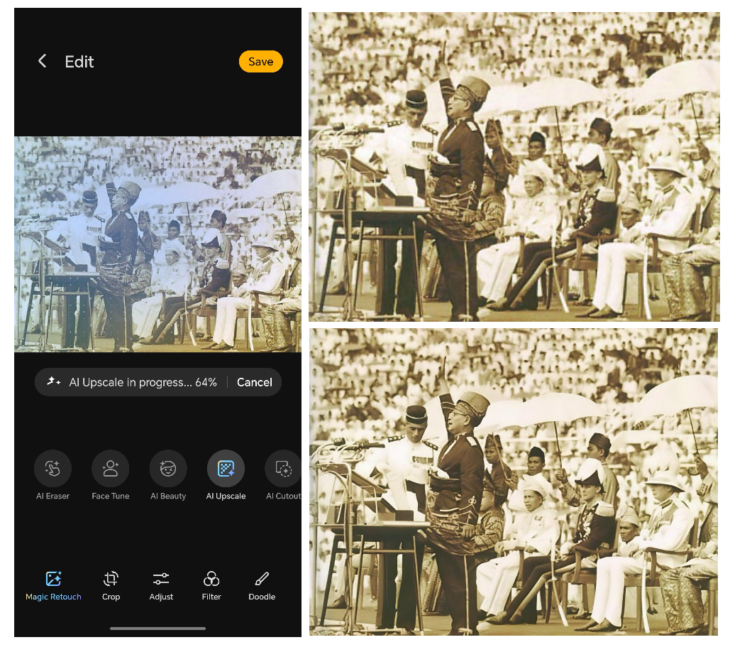 Ciri AI Upscale pula menjadikan foto lama atau berkualiti rendah kelihatan lebih jelas dan terperinci.