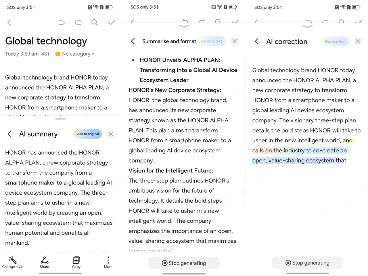 AI Translation mengatasi batasan bahasa dalam perbualan . Ianya menawarkan sokongan terjemahan pantas dalam 13 bahasa, termasuk Bahasa Malaysia, Jepun dan Korea semasa perbualan bersemuka dan HONOR juga komited untuk menawarkan sokongan bagi lebih banyak bahasa dari semasa ke semasa.