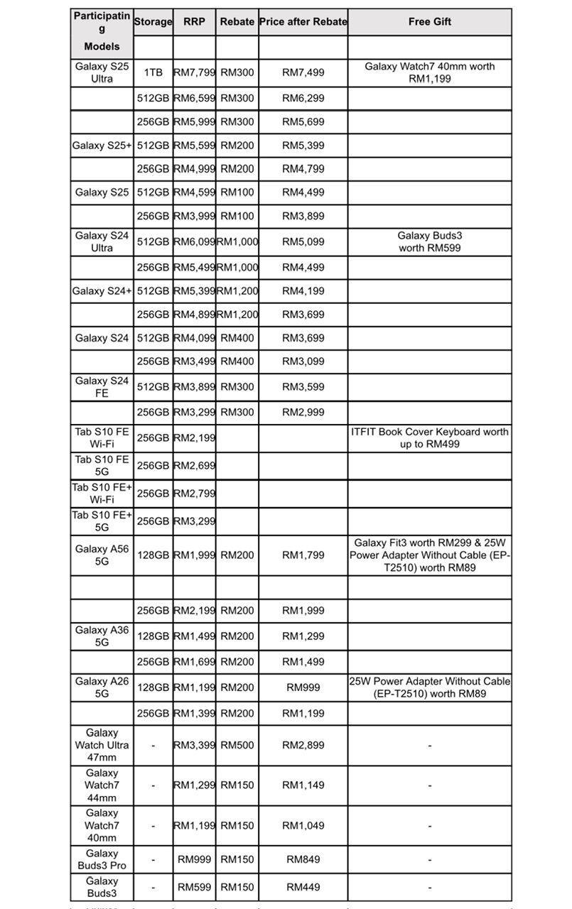 Antara produk Samsung yang ditawarkan pada harga diskaun selain hadiah perrcuma bagi beberapa produk terpilih adalah Samsung Galaxy S25 Series, Galaxy S24 Series, Galaxy Tab S10 FE Series, Galaxy A Series, Galaxy Watch Ultra, Galaxy Watch7 Series dan Galaxy Buds3 Series.
