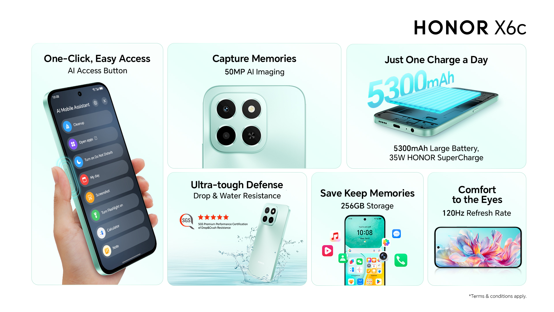 HONOR telah mengesahkan bahawa telefon pintar HONOR X6c telah mula ditawarkan di Malaysia . Ianya menggabungkan pengalaman pengguna yang berteraskan AI, jangka hayat bateri yang lebih berkuasa, ketahanan luar biasa, dan prestasi lancar. Ia direka khas untuk memenuhi keperluan warga emas, kanak-kanak, dan remaja.