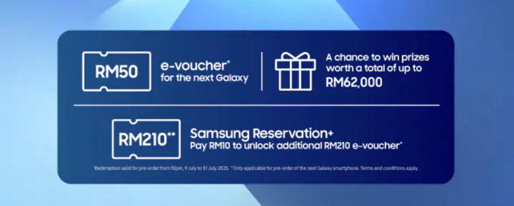mulai sekarang hingga 9 Julai 2025, 9:59 P.M., daftar minat anda untuk menerima baucar RM50 bagi pra-pesanan peranti Galaxy Z Series yang akan dilancarkan di Galaxy Unpacked. Pelanggan yang telah melengkapkan pendaftaran minat juga layak untuk membeli baucar Samsung Reservation+ dengan membayar RM10 semasa tempoh promosi dan menerima kod baucar bernilai RM210!