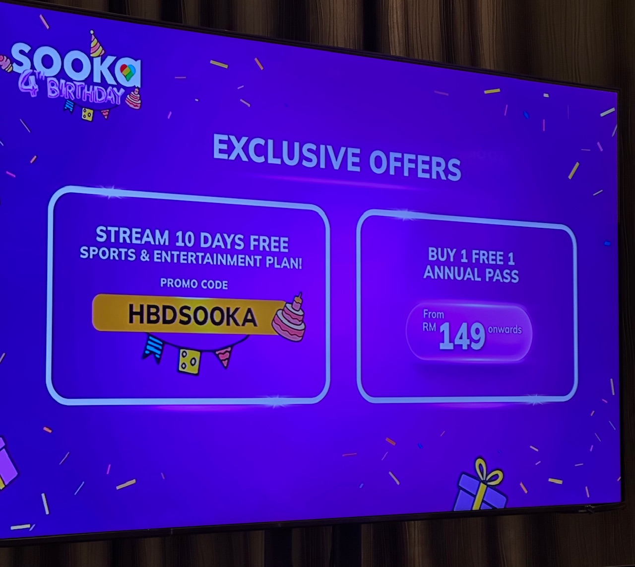 Sebagai tanda penghargaan kepada pelanggan, sooka menawarkan pelbagai ganjaran ulang tahun sehingga 31 Julai 2025. Pelanggan baharu boleh menikmati akses percuma selama 10 hari kepada pelan Sports & Entertainment dengan kod promosi HBDSOOKA.