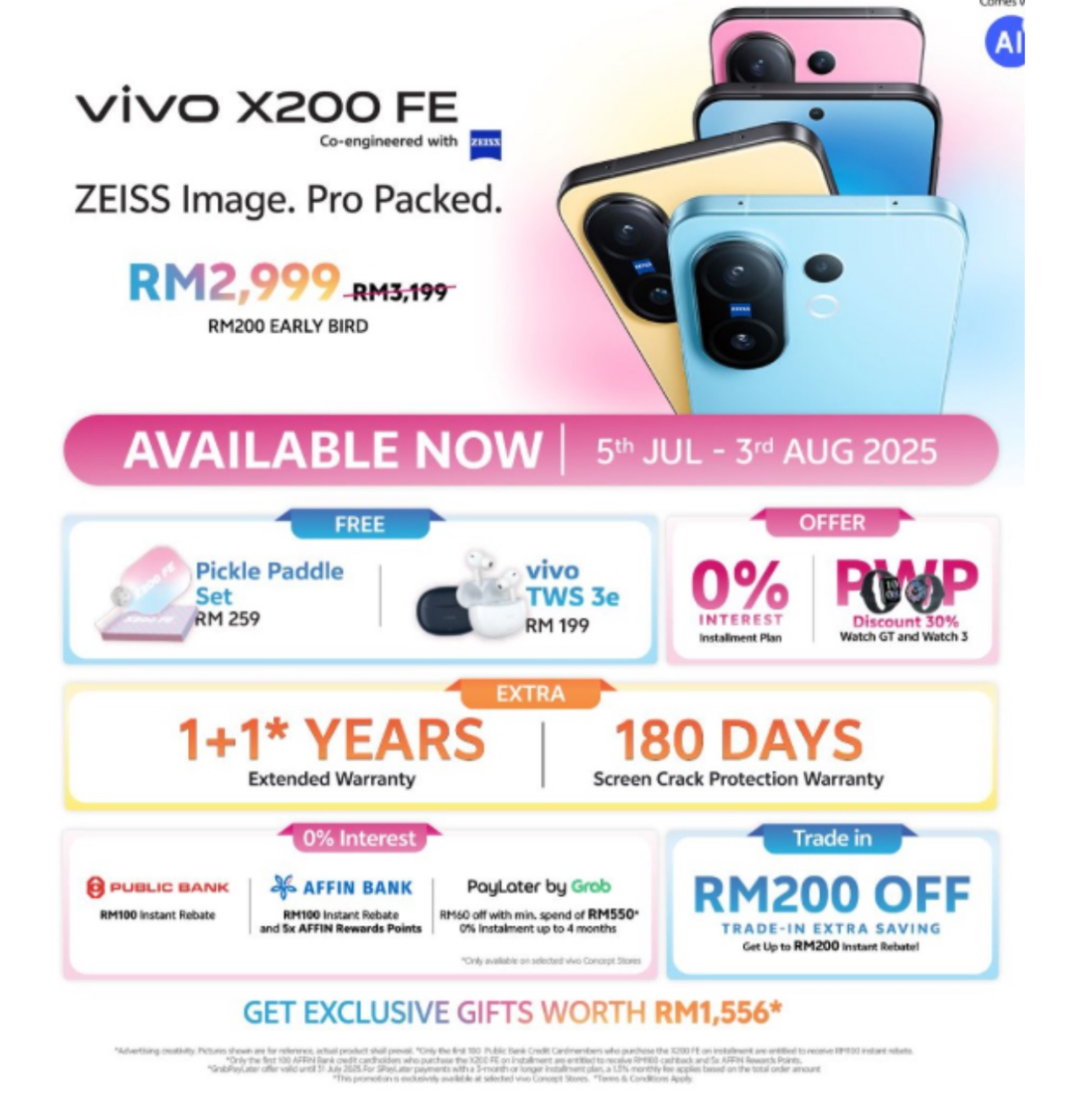 dari 5 Julai hingga 3 Ogos 2025, rakyat Malaysia boleh memiliki vivo X200 FE pada harga RM2,999, termasuk rebat segera RM200, bersama-sama dengan pelbagai hadiah dan faedah eksklusif, termasuk: