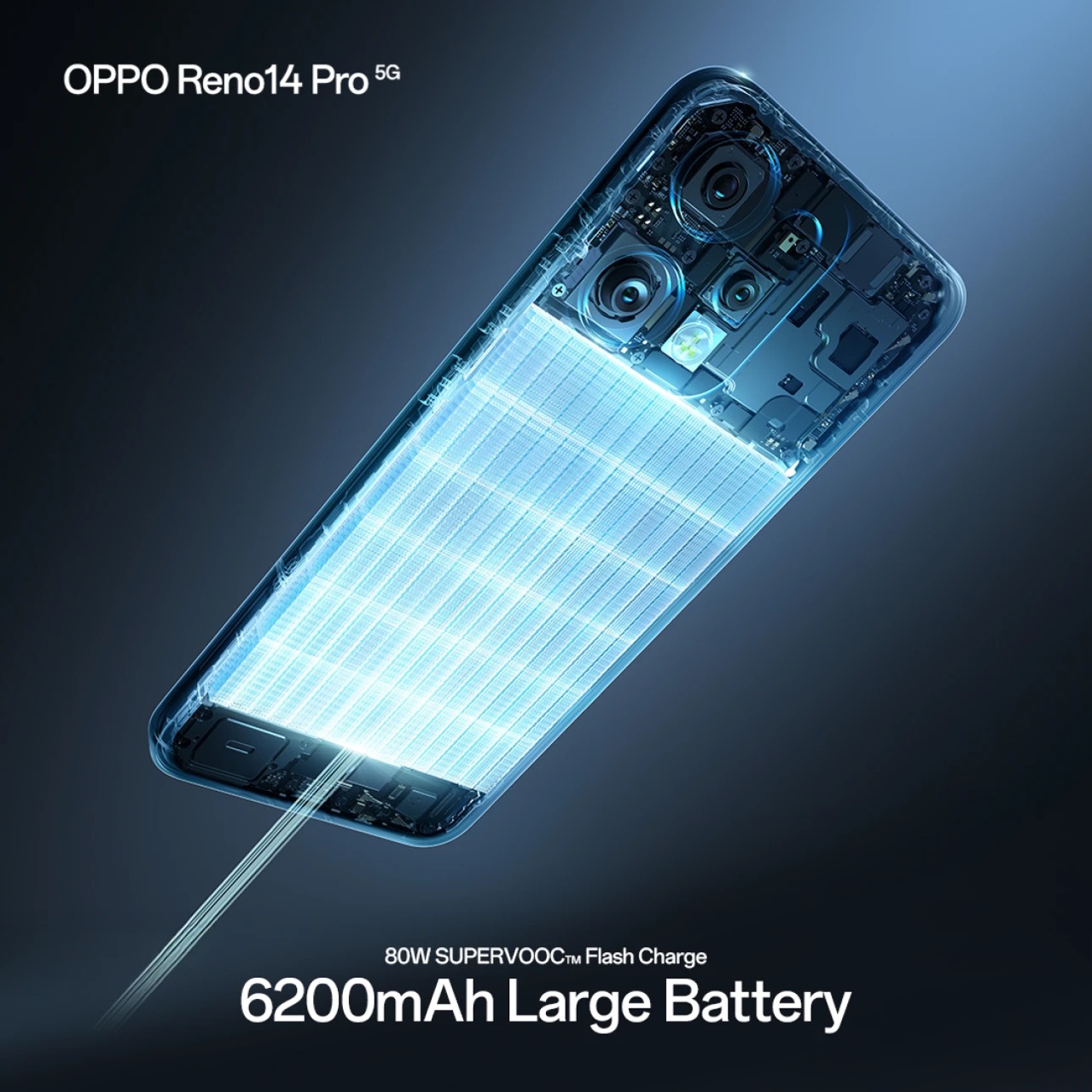 OPPO Reno14 Pro 5G hadir dengan bateri berkapasiti 6,200 mAh yang menawarkan ketahanan bateri yang sangat baik, tahan satu hari penuh walaupun dengan penggunaan intensif, atau sehingga dua hari untuk penggunaan lebih ringan.