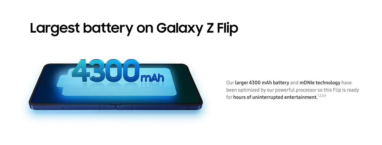Samsung Galaxy Z Flip7 hadir dengan bateri berkapasiti 4,300mAh iaitu 300mAh lebih besar berbanding Galaxy Z Flip6 pada kerangka yang lebih nipis dan hanya 100mAh lebih kecil berbanding bateri pada Galaxy Z Fold7 (4400mAh).