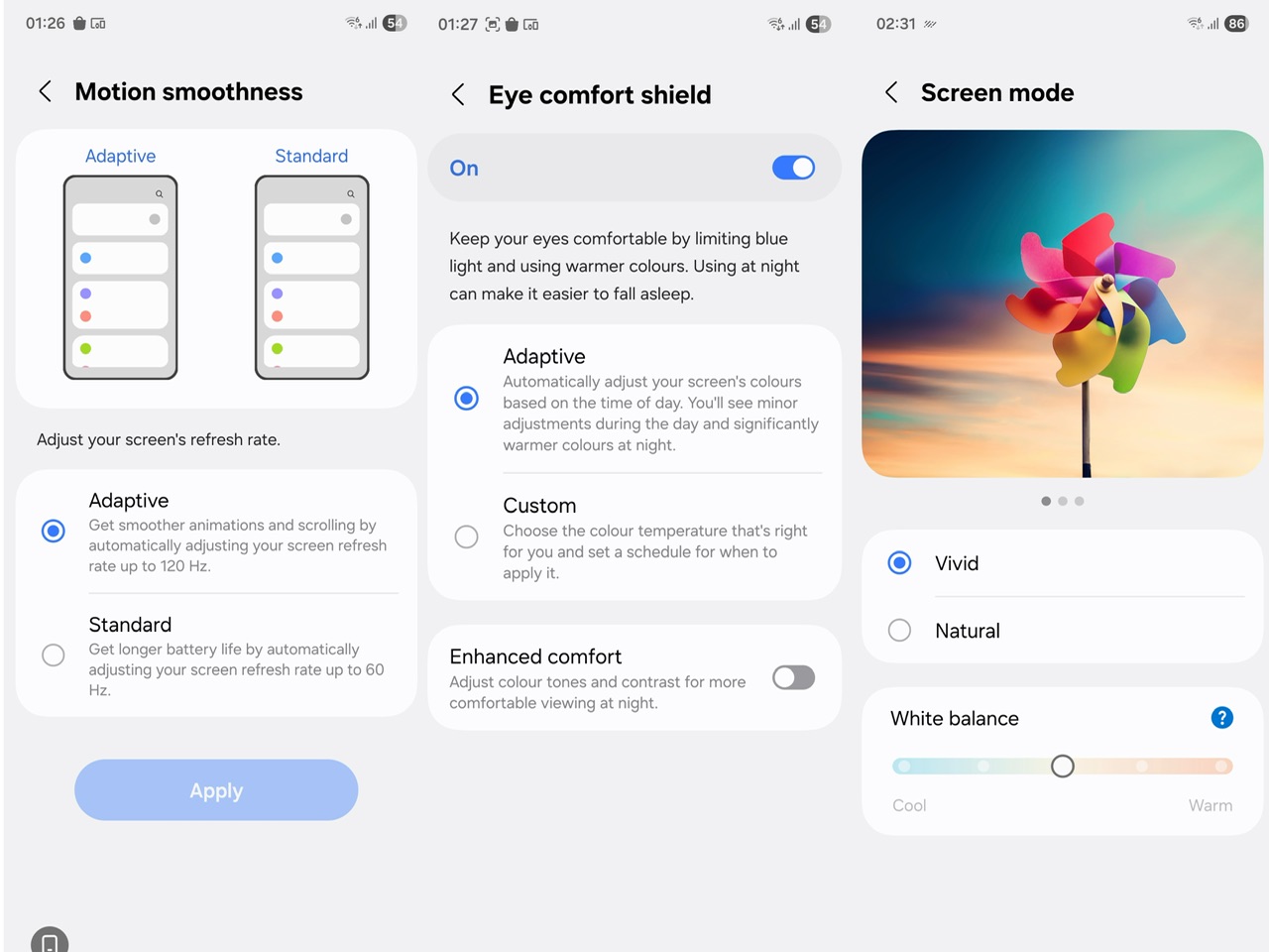 Beralih kepada warna paparan, Samsung menawarkan dua mod warna iaitu Vivid dan Natural. Vivid memberikan anda warna yang lebih pekat manakala Natural memberikan penghasilan warna yang lebih semulajadi dan sedikit kurang berbanding paparan vivid.