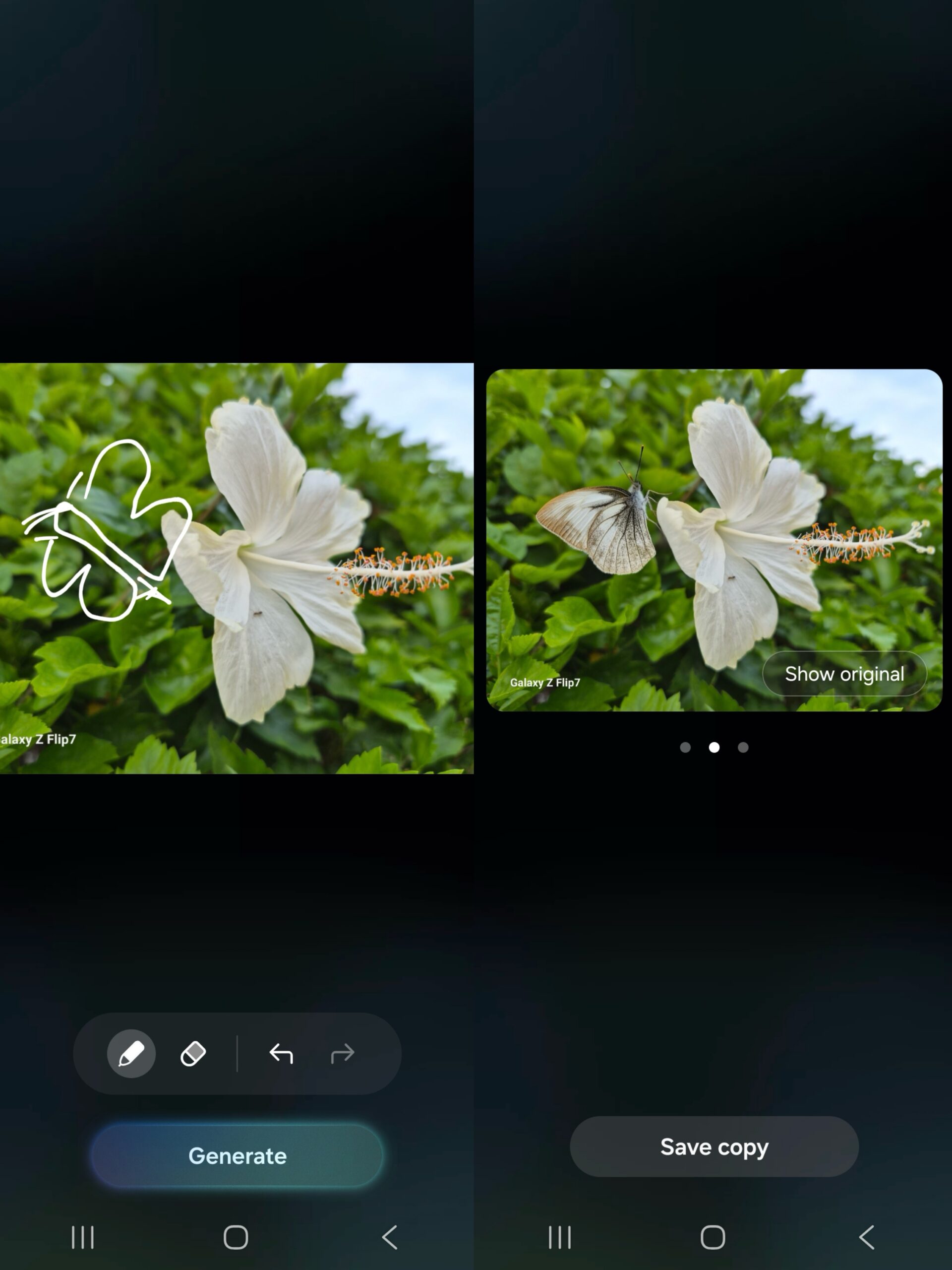 Ciri Galaxy AI yang ada pada Galaxy Z Flip7 akan menawarkan anda pengalaman yang lebih melalui bantuan AI. Sebagai contoh, ciri Sketch to Image membolehkan anda menambah objek pada gambar dan ianya boleh dibuat melalui lakaran kasar anda sebelum Galaxy AI menganalisa gambar tersebut dan menawarkan beberapa contoh gambar dengan objek yang dijana oleh AI.