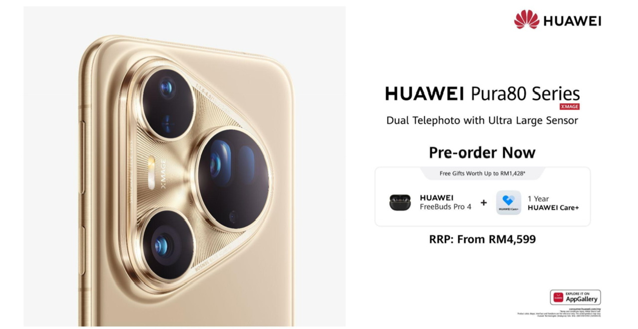 Pra-tempah HUAWEI Pura80 Series di HUAWEI Official Website, HUAWEI Official Store di Shopee, HUAWEI Flagship Store di Lazada, dan HUAWEI Official TikTok Shop, dapatkan hadiah percuma bernilai sehingga RM1,428, termasuk HUAWEI FreeBuds Pro 4 dan HUAWEI Care+ bernilai satu tahun.