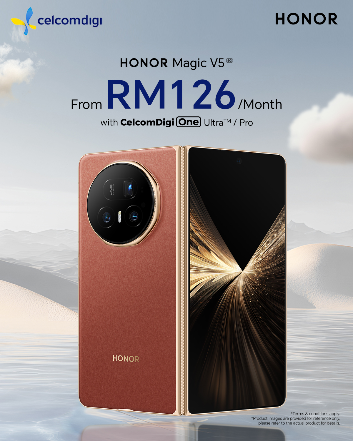 CelcomDigi menawarkan HONOR Magic V5 pada harga serendah RM126 sebulan melalui CelcomDigi One UltraTM Pro. Untuk maklumat lanjut, kunjungi laman sesawang CelcomDigi.