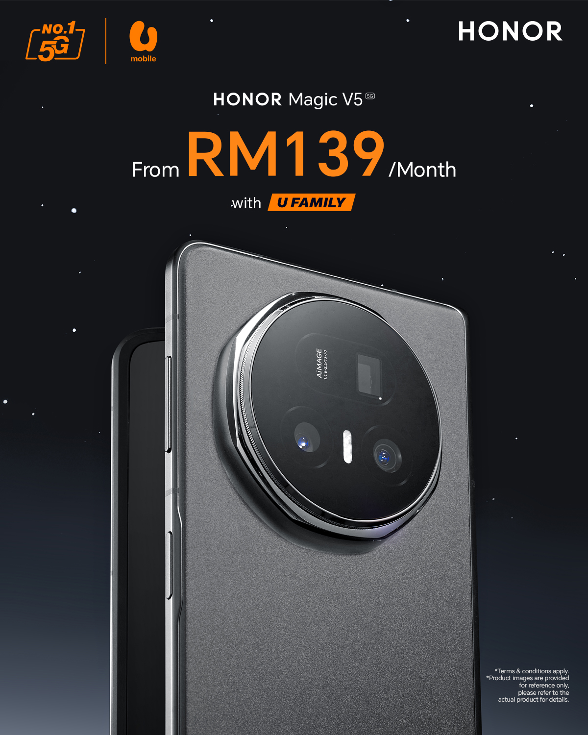 Dengan U Mobile, HONOR Magic V5 boleh dimiliki pada pelan yang bermula dari RM139 sebulan! Pelanggan juga boleh menikmati penjimatan tambahan dengan pelan pascabayar pilihan mereka tanpa sebarang bayaran pendahuluan. Untuk butiran lanjut, kunjungi laman sesawang rasmi U Mobile.