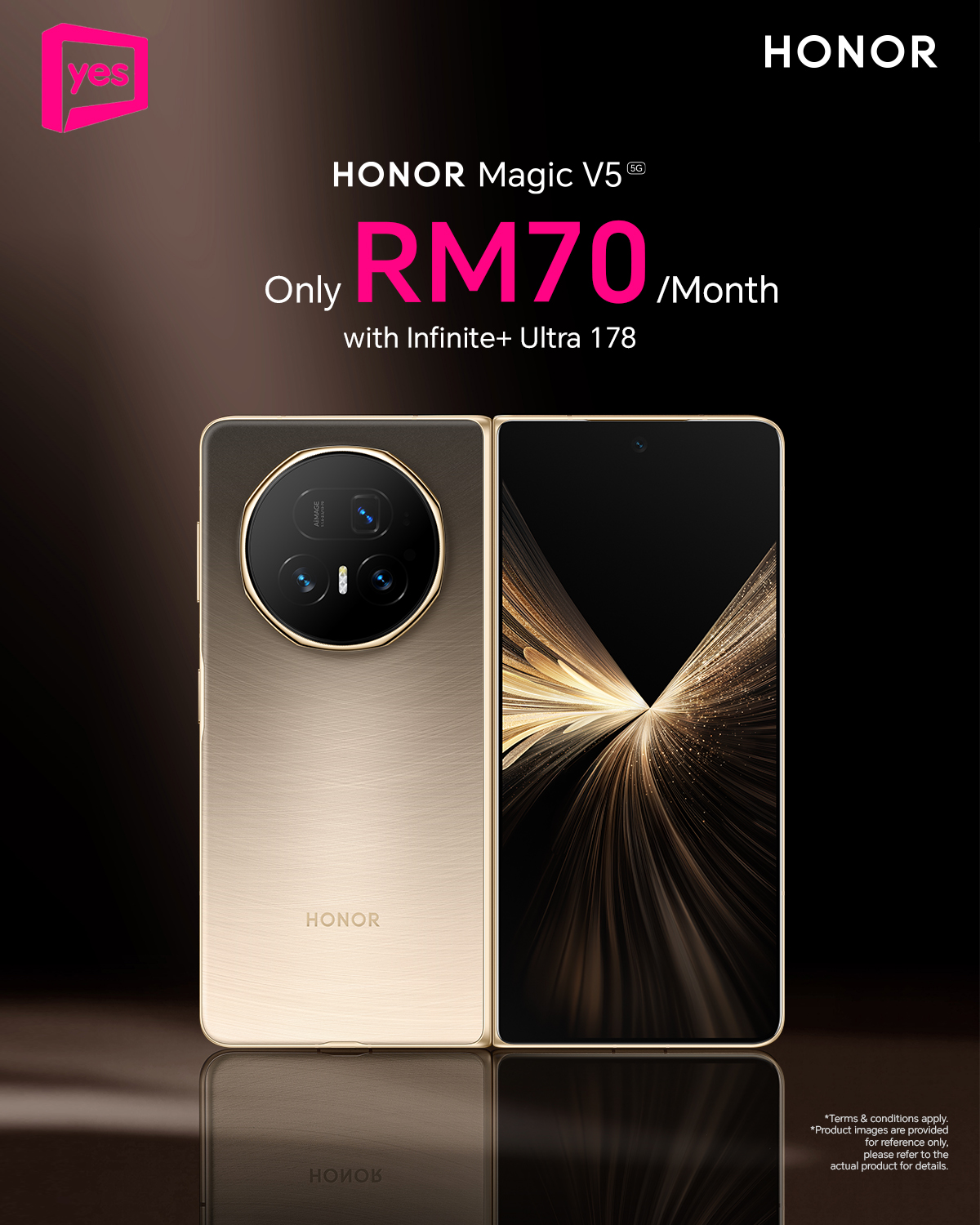 Memang benar! Dengan Yes 5G, HONOR Magic V5 boleh menjadi milik anda dengan pelan yang bermula dari  RM70 sebulan! Dapatkan maklumat lanjut mengenai pelan menarik ini melalui laman sesawang rasmi Yes.