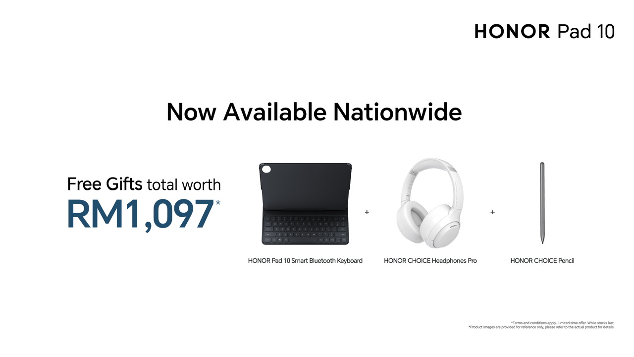 Tambahan pula, pembeli juga akan menerima pakej hadiah PERCUMA bernilai RM1,097 yang merangkumi Smart Bluetooth Keyboard, HONOR Pencil dan fon telinga HONOR CHOICE Active Noise Canceling Headphone.