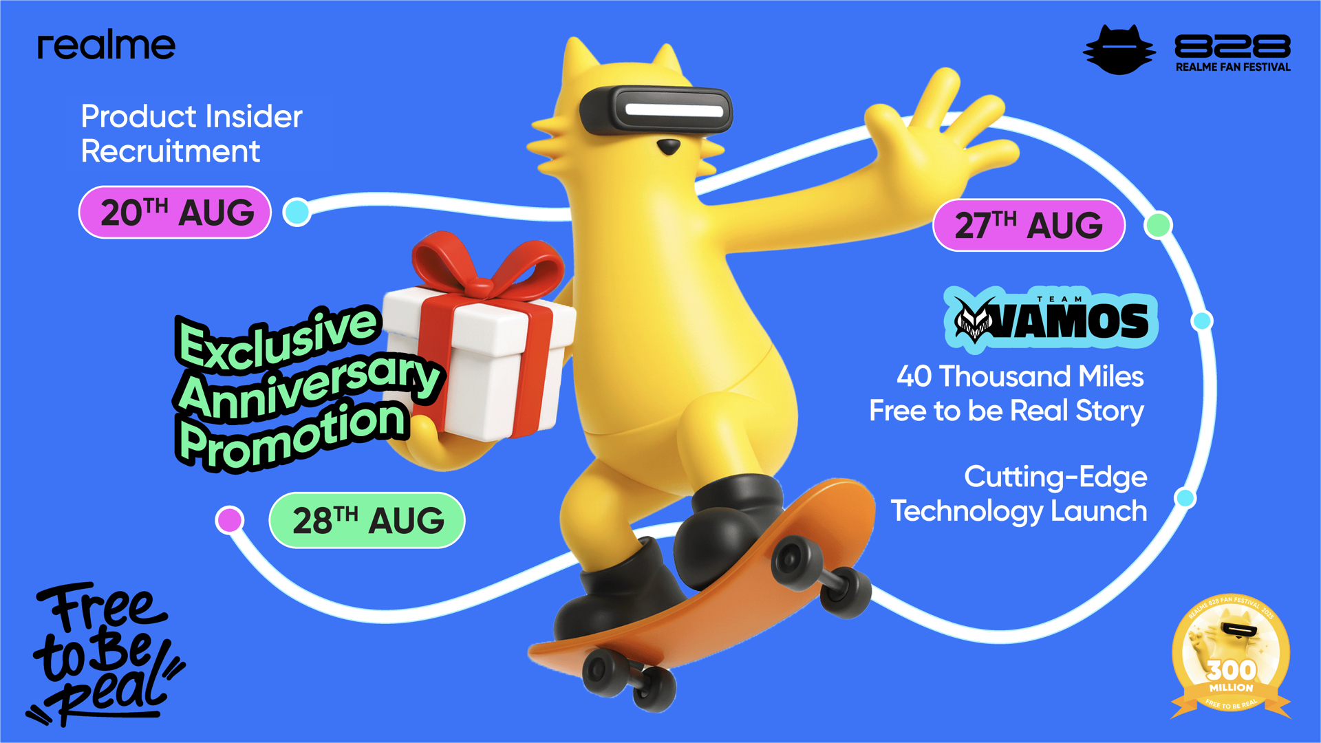 Free to Be RealOn setiap 28 Ogos, realme akan meraikan ulang tahunnya dengan Festival Peminat. Untuk Festival Peminat tahun ini, realme melancarkan kempen ‘Free to Be Real’, memperjuangkan komuniti untuk menerima kehidupan dan hidup sepenuhnya. Memusatkan kempen ‘Free to Be Real’ ialah Limited realmeow 300M Commemorative Edition, koleksi realmeow yang gebu dan comel yang menarik perhatian  semua.