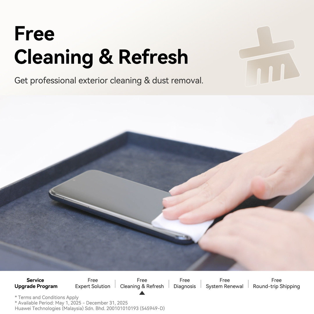 HUAWEI mahu memastikan telefon pintar atau peranti audio HUAWEI (yang lebih sukar untuk dibersihkan) kekal bersih seperti pada hari pertama digunakan dan ketika kempen Service Upgrade Program ini, anda boleh membawa telefon pintar atau produk audio anda ke pusat servis HUAWEI yang berhampiran untuk menikmati pembersihan secara percuma yang termasuk pembersihan port pengecasan, speaker, skrin paparan dan banyak lagi.