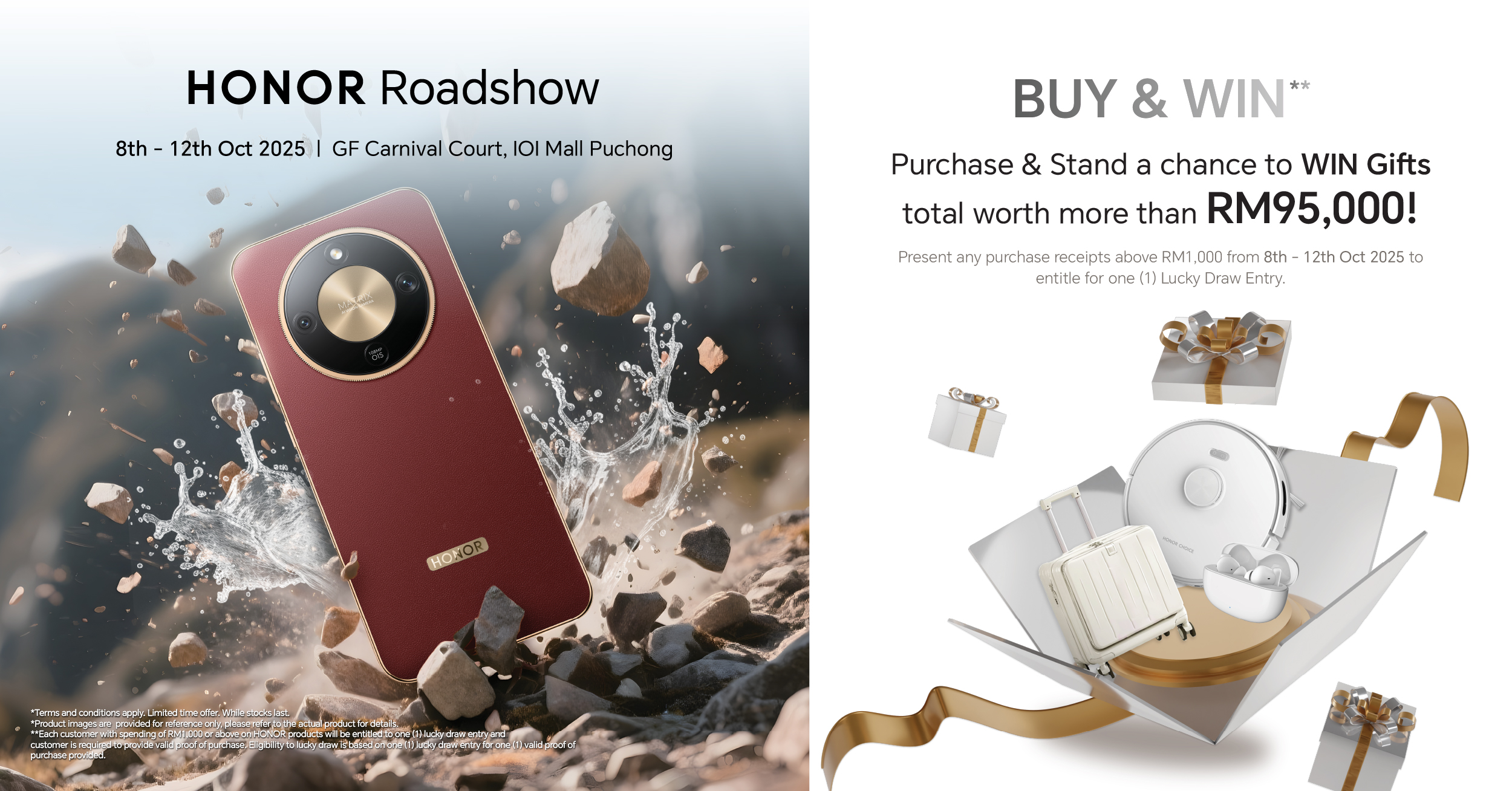 Lebih menarik, pengunjung yang membuat pembelian berjumlah RM1,000 dan ke atas dalam satu resit layak menyertai cabutan bertuah bernilai lebih RM95,000, dengan pembeli HONOR X9d 5G akan menerima dua penyertaan. Hadiah menarik termasuk HONOR Pad 10 5G, HONOR CHOICE Robot Cleaner R2, bagasi HONOR dan barangan eksklusif lain.