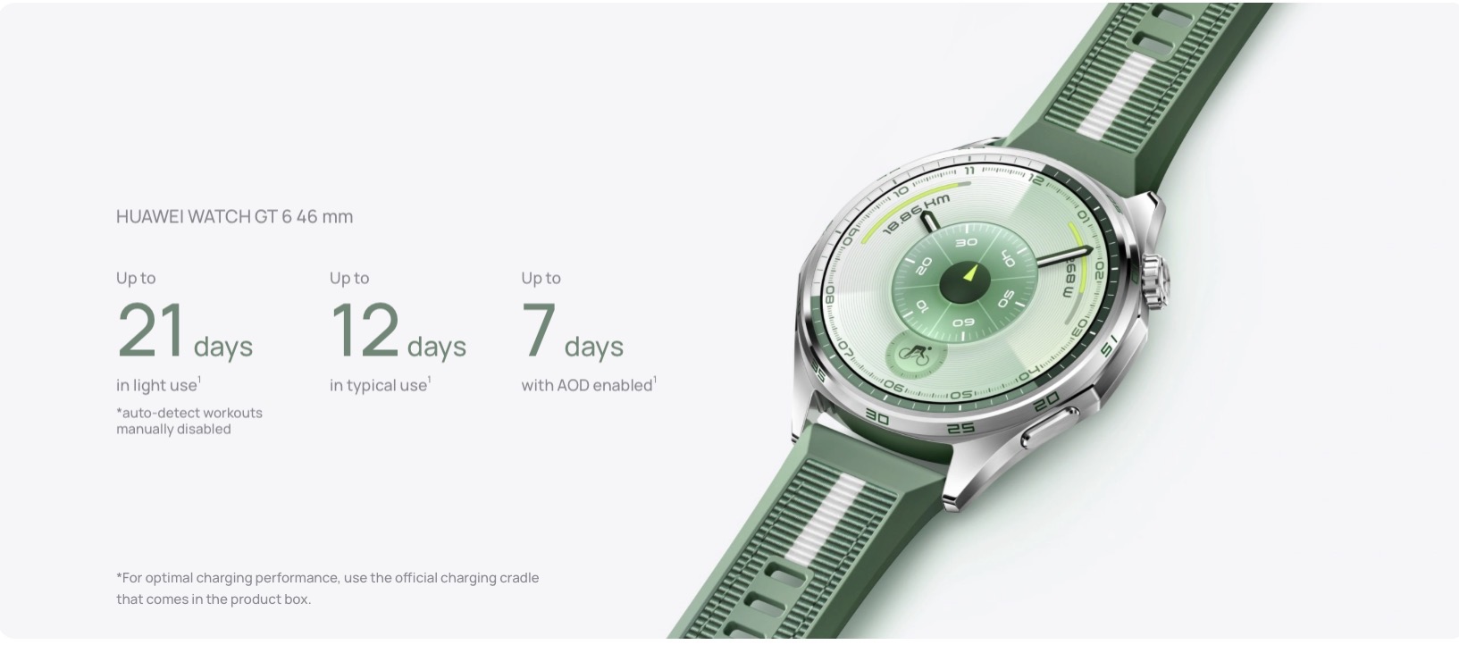 HUAWEI Watch GT 6 menawarkan sehingga 21 hari jangka hayat bateri yang mana bateri yang digunakan adalah jenis high-silicon yang mana kadar ketumpatan tenaga adalah 37% lebih tinggi. Jika anda mengaktifkan ciri AOD, ianya mampu menawarkan sehingga 7 hari penggunaan.