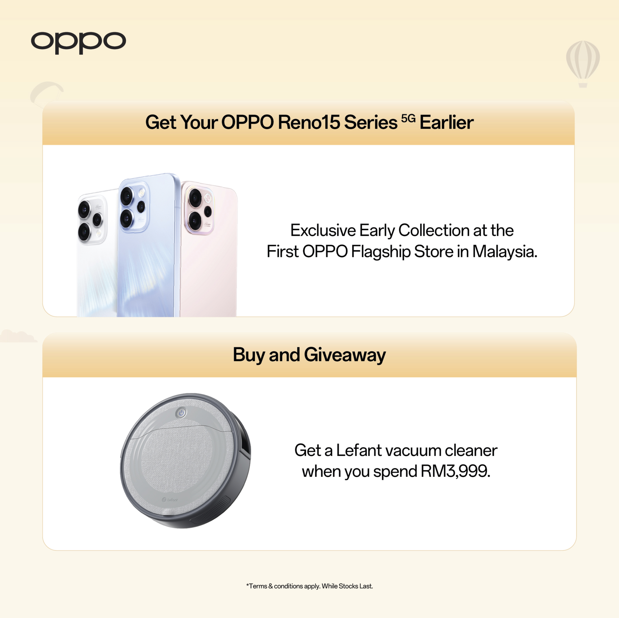 • Beli mana-mana peranti siri OPPO Reno15 untuk mendapatkan OPPO Watch S pada harga PWP istimewa RM99, dan terima Super Star Ollie sebagai hadiah percuma