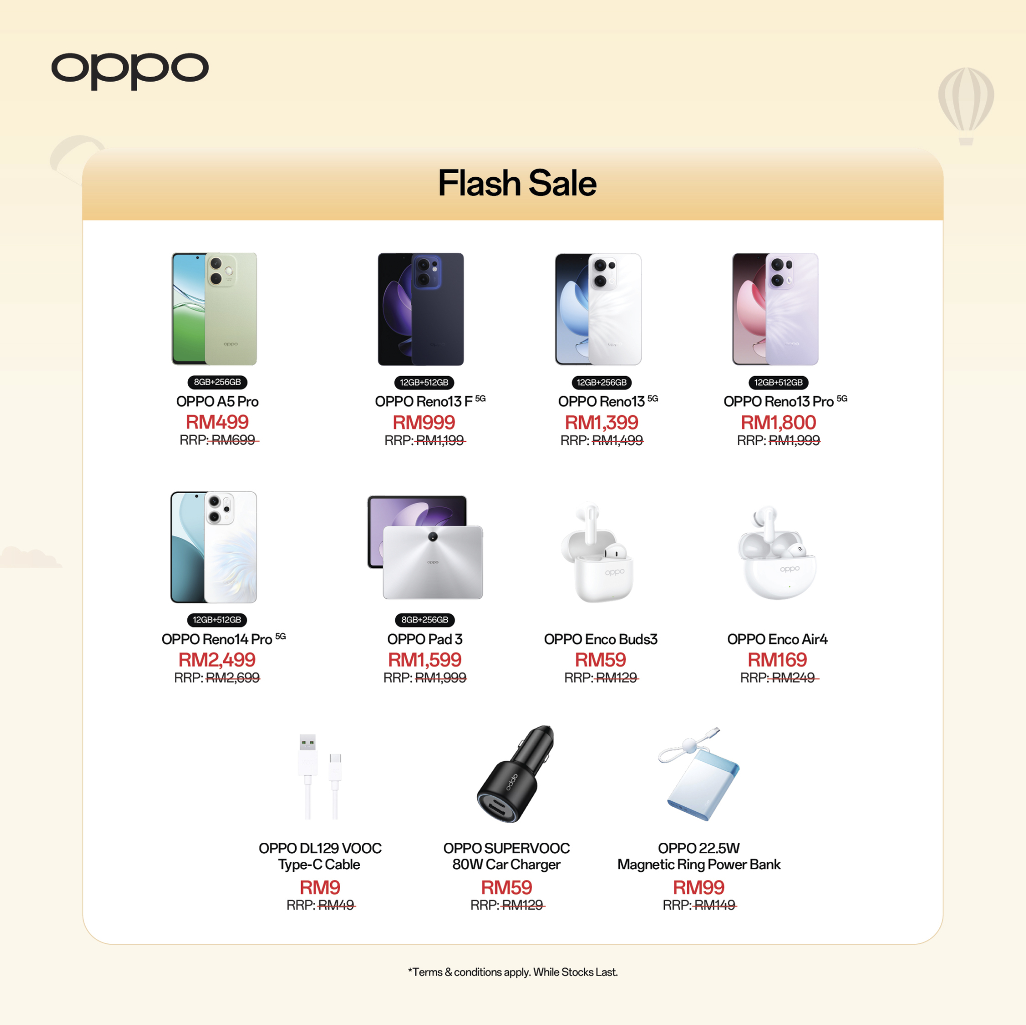 • Jualan kilat untuk peranti dan aksesori terpilih, dengan telefon pintar seperti OPPO A5 Pro (8GB+256GB) dan OPPO Reno13F 5G (12GB+512GB) tersedia dengan harga serendah RM499 dan RM999 masing-masing.