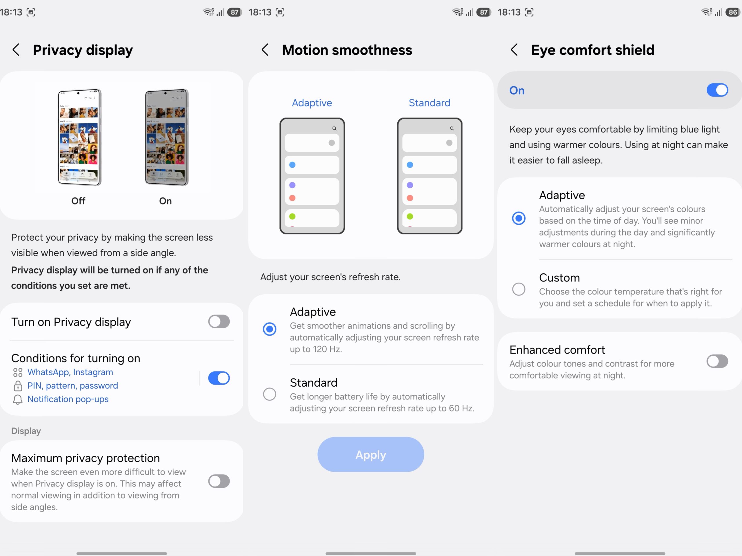Seterusnya, Samsung menawarkan pelbagai tetapan skrin seperti kadar segar semula yang mempunyai dua pilihan iaitu Adaptive (1~120Hz) dan Standard (60Hz), mod Eye Comfort Shield untuk skrin yang lebih ‘mesra’ pada mata, tetapan resolusi skrin ( HD+, FHD+ atau QHD+).