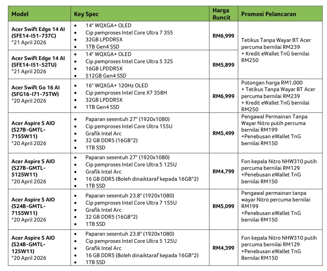 Acer Swift Go 16 AI dan desktop Acer Aspire S kini boleh didapati melalui penjual rasmi Acer serta eKedai Acer. Sementara itu, Swift Edge 14 AI ditawarkan melalui pra-tempahan sehingga 27 April 2026.
